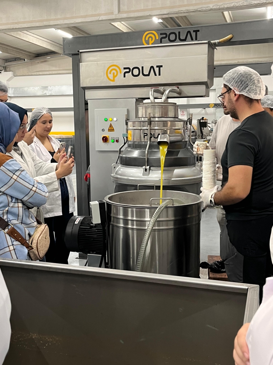 Öğrenciler, tesis bünyesindeki modern üretim ekipmanlarını inceleyerek ilk zeytinyağı sıkımını uygulamalı olarak öğrendi. Üretilen zeytinyağı üzerinde ayrıca temel kimyasal ve duyusal analizler gerçekleştirildi.
