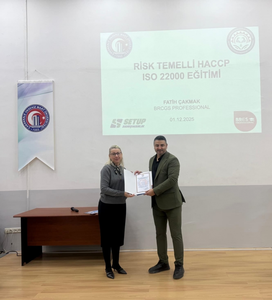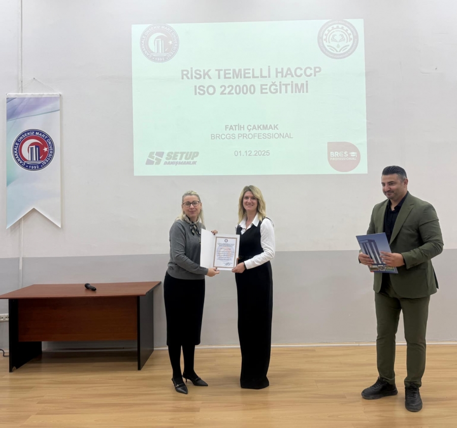 Meslek Yüksekokulumuz, Gıda İşleme Bölümü olarak bölüm öğrencilerine, gıda güvenliği alanında farkındalığı artırmak ve öğrencilerimizin sektörel yetkinliklerini güçlendirmek amacıyla ISO 22000 Gıda Güvenliği Yönetim Sistemi ve HACCP (Tehlike Analizi ve Kritik Kontrol Noktaları) konularında kapsamlı bir eğitim programı düzenlenlendi.
